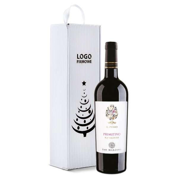 Zawsze pożądane w Polsce Primitivo od czołowego producenta Puglii -San Marzano, w ekologicznym pudełku prezentowym z wyciętym logo świątecznym. Nad motywem świątecznym możemy wyciąć laserowo Twoje logo.